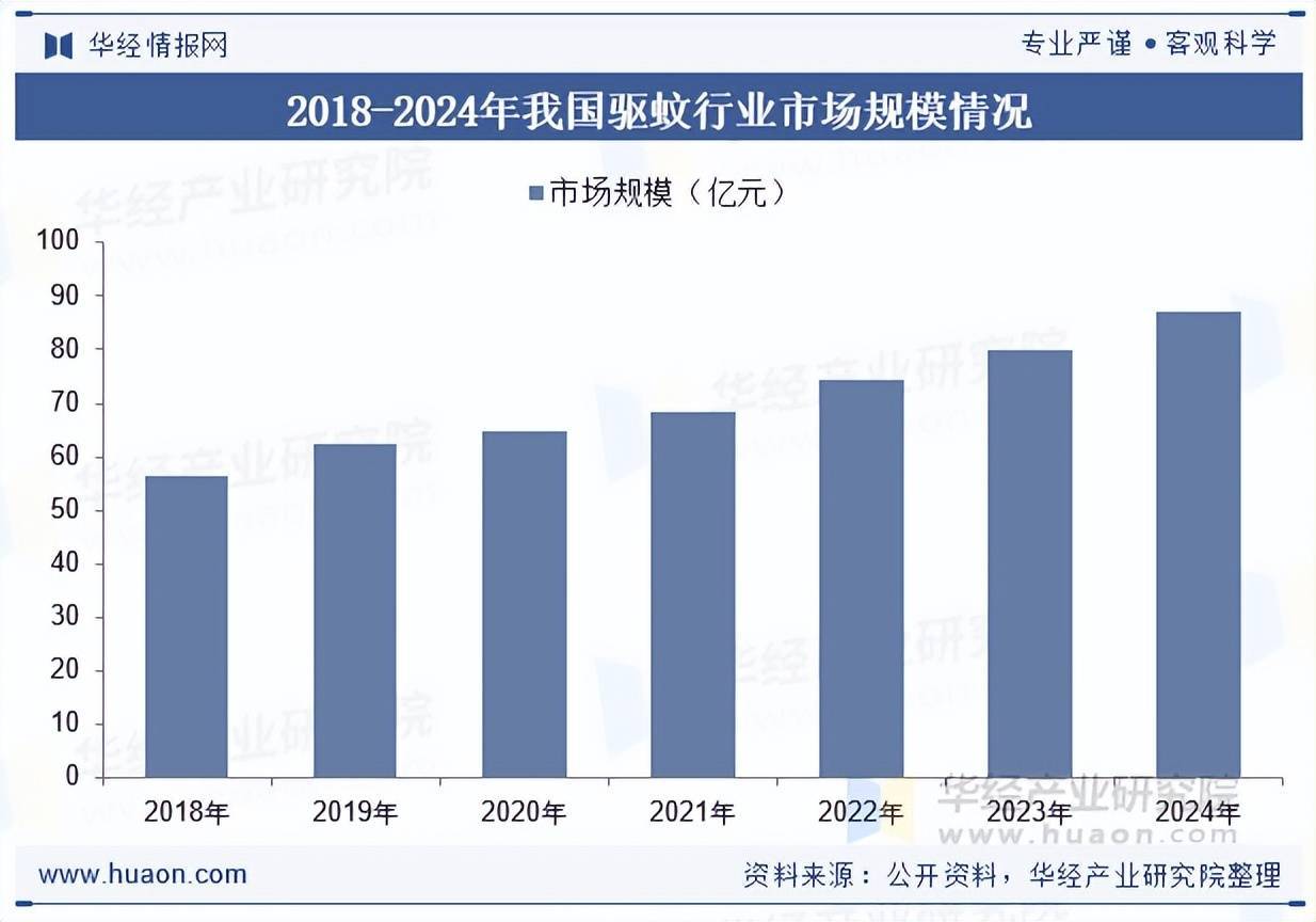 驱蚊需求自古有之,驱蚊产品也已成为居民日常生活中偏刚需的消费品。与此同时,我国庞大的人口基数更是为驱蚊市场持续扩容奠定了基础。据统计2018年至2024年我国驱蚊行业市场规模由56.58亿元增长至87.33亿元,年复合增长率约为7.5%。